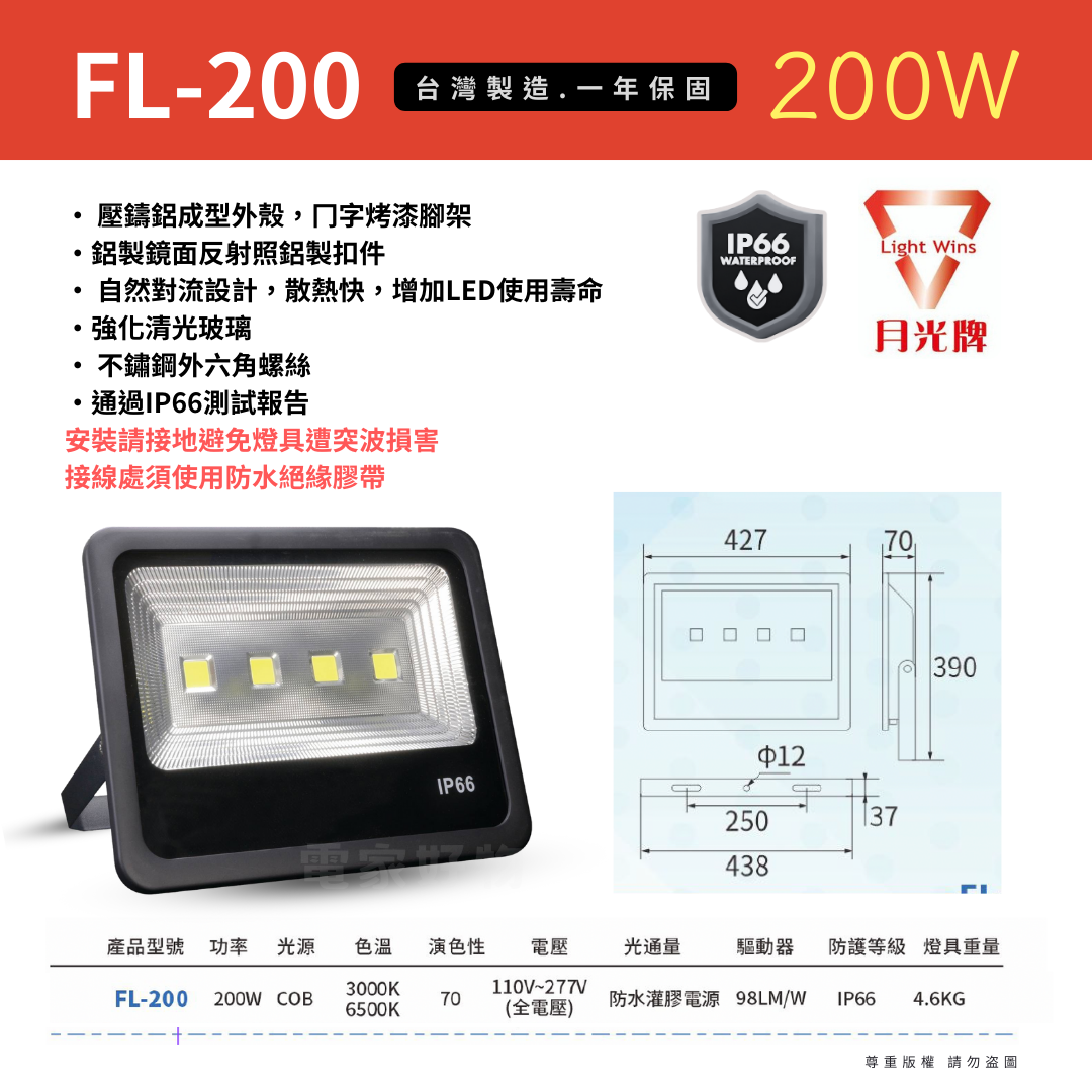 200W:適合大型戶外空間或停車場,提供強勁照明。