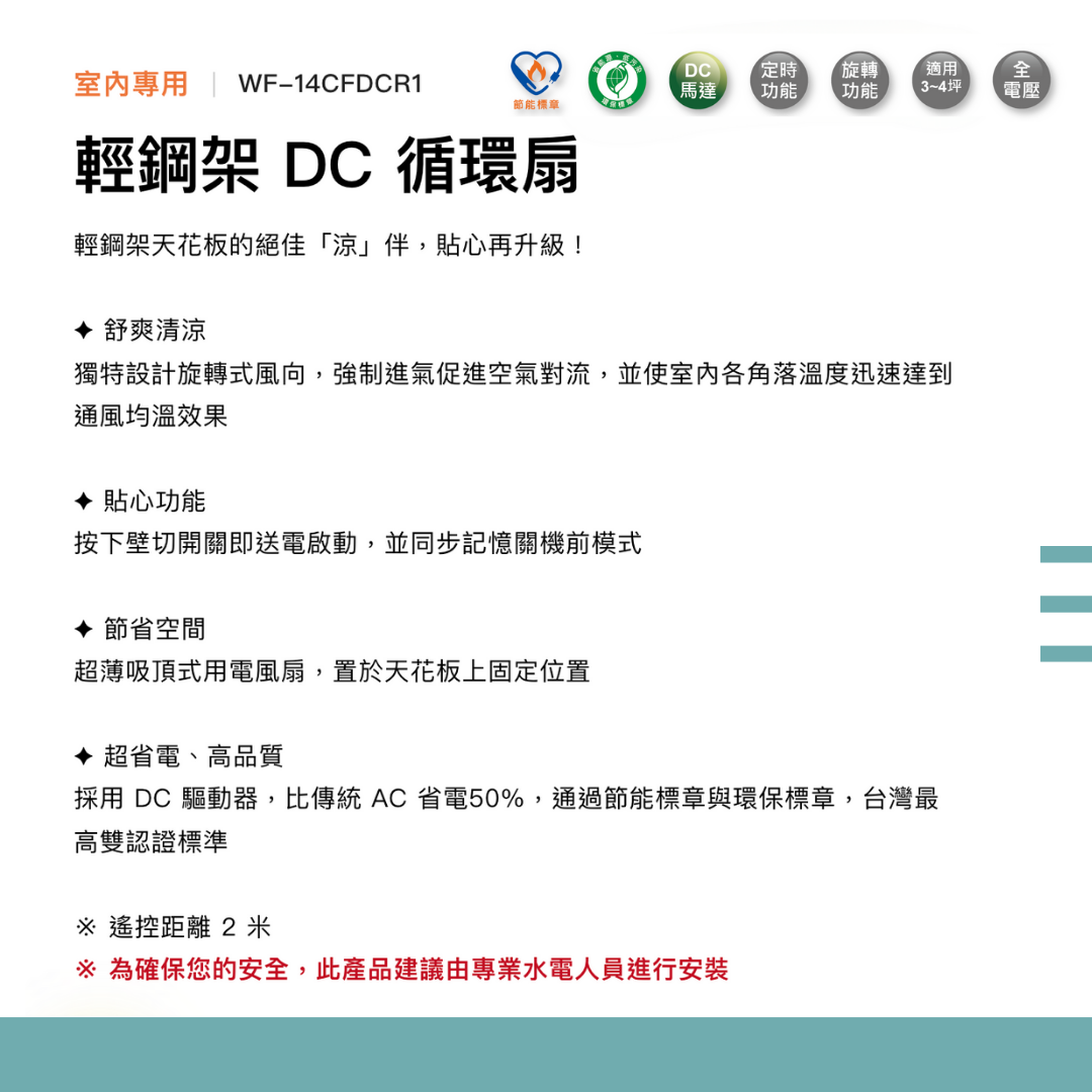 * 全電壓 DC 設計,低噪音、省電 50%(比傳統 AC)