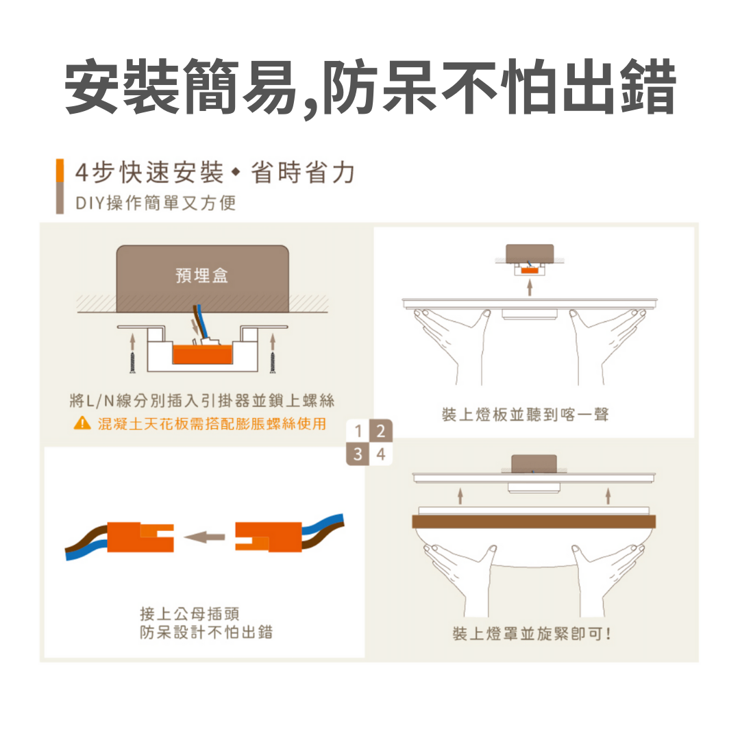 燈體材質:鐵材烤白漆、PC擴散罩、PC防觸電罩、ABS邊框