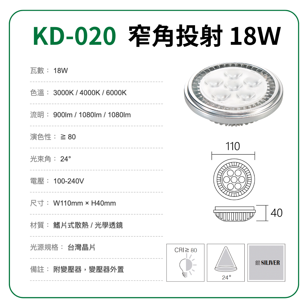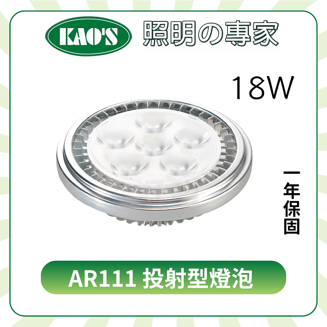 KAO'S AR111 LED 高照度 燈泡型號 KD-020材質 鰭片散熱、光學透鏡電壓(V) 100~240V功率(W) 18光通亮(lm)900 / 1080色溫(K) 3000/4000/6000演色性CRI >80光束角 24°光源規格 台灣晶片