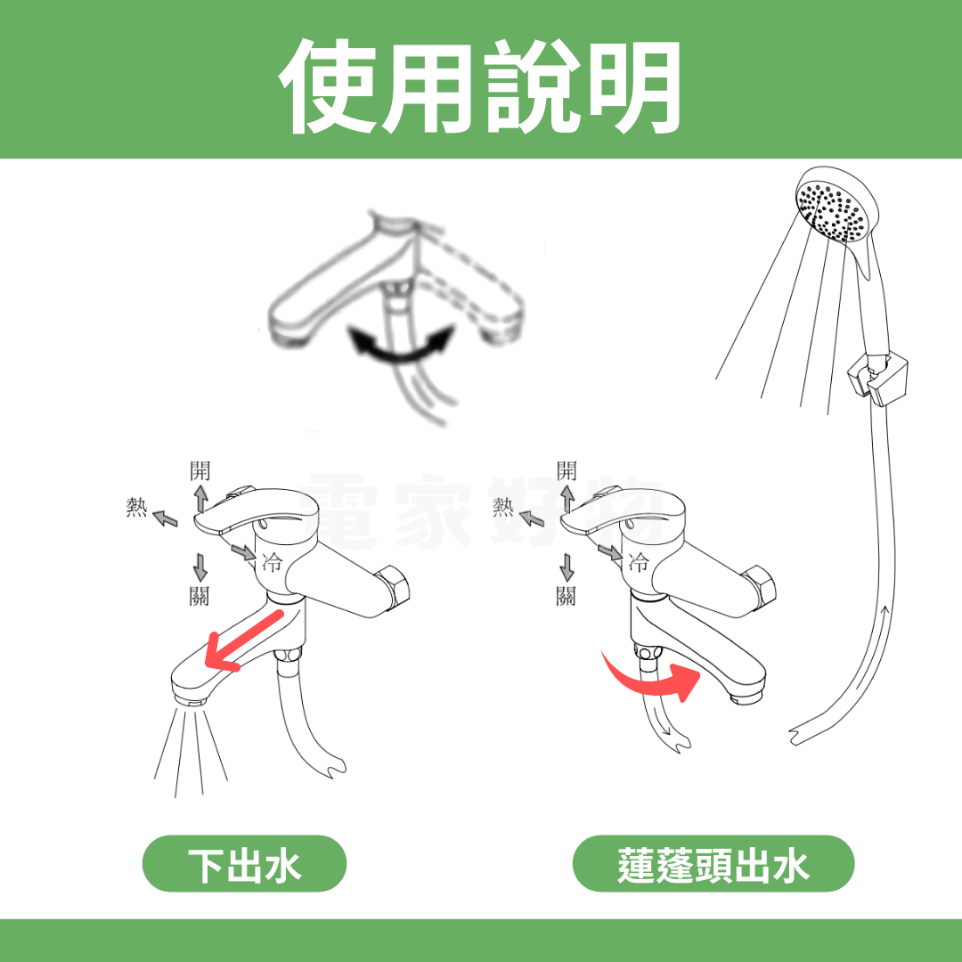 🔶 一指切換設計,出水管朝前為下出水管出水,向右撥,即切換為蓮蓬頭出水,直覺操作,不佔淋浴空間。