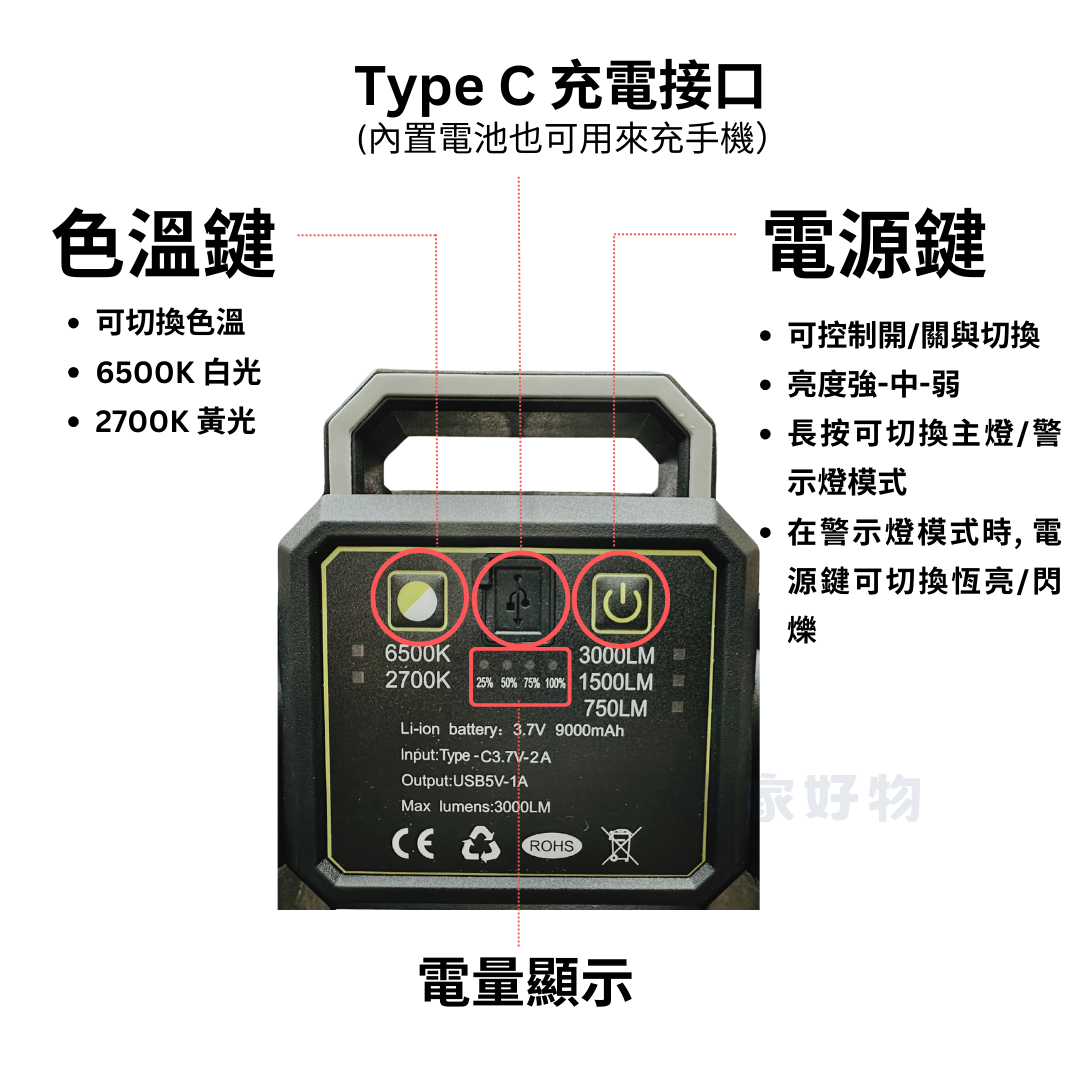 亮度與模式調節:電源鍵控制開關、亮度(強-中-弱)及切換主燈/警示燈